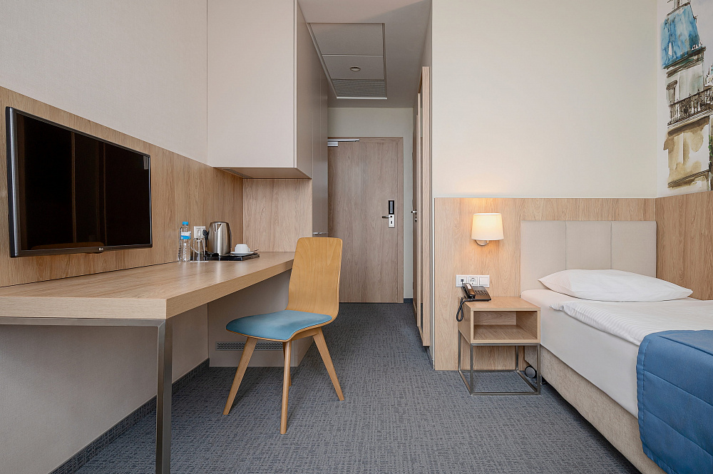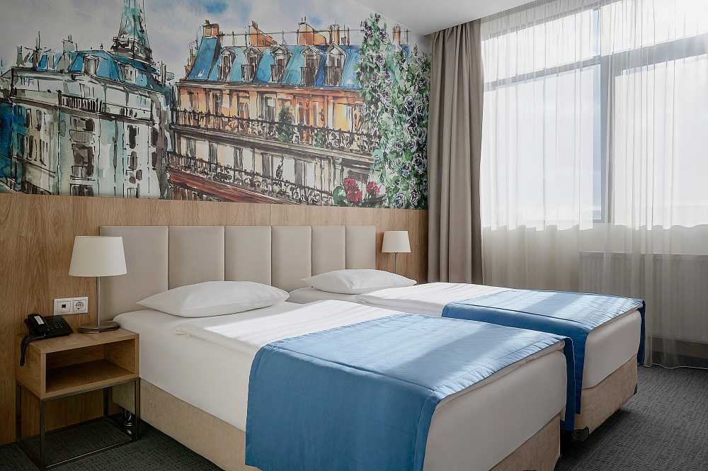 Тишина, комфорт и современное оснащение – вот отличительная черта любого выбранного вами номера в данном отеле. Вы забудете, что за окнами – центр города благодаря эффективной звукоизоляции и возможности полностью затемнить номер при помощи специальных штор. Настоящий отдых и крепкий сон обеспечивают ортопедические матрасы с регулировкой жёсткости и возможность выбрать подушку на свой вкус.