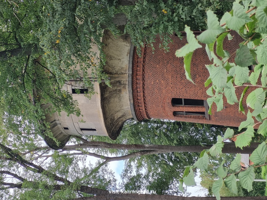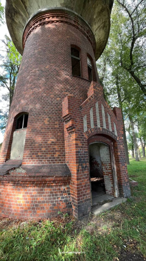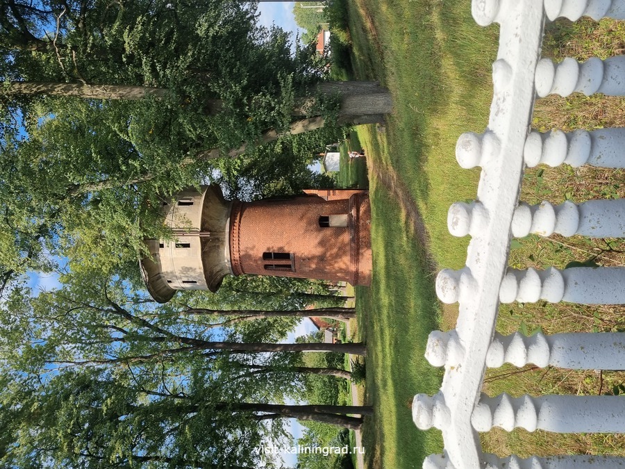 Двигаемся по уютной улочке Октябрьская к Калининградскому шоссе, по которому, скорее всего, въезжали в город. Здесь предлагаем обратить внимание – уже виднеется Водонапорная башня Гердауэна. Рядом красивое здание школы, 1928 года постройки при желании можно прогуляться и рассмотреть поближе. К слову, это первая школа в Железнодорожном, до этого дети обучались дома или при монастыре.