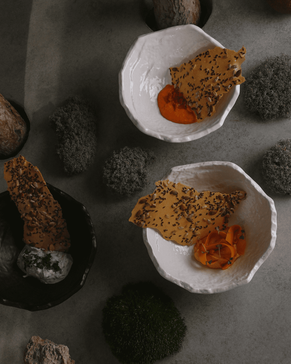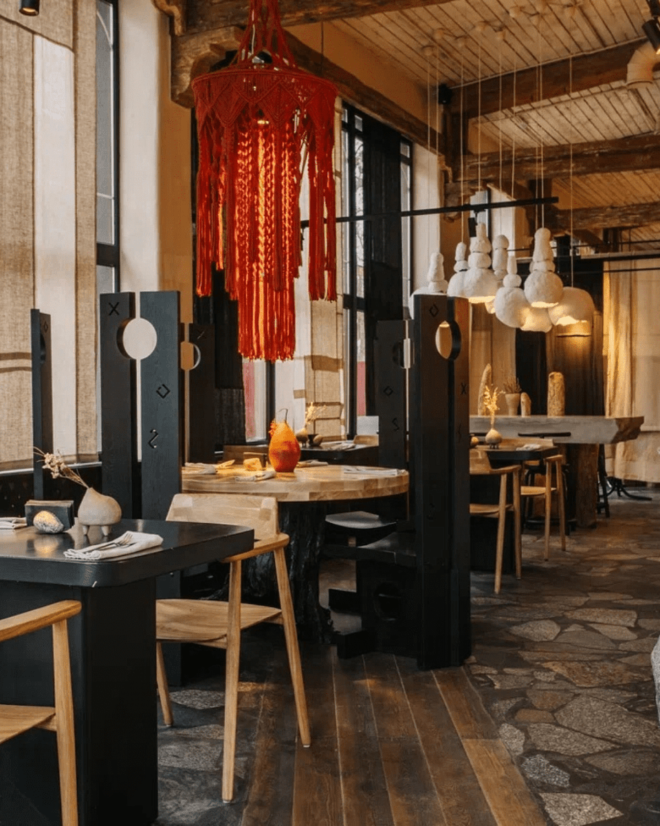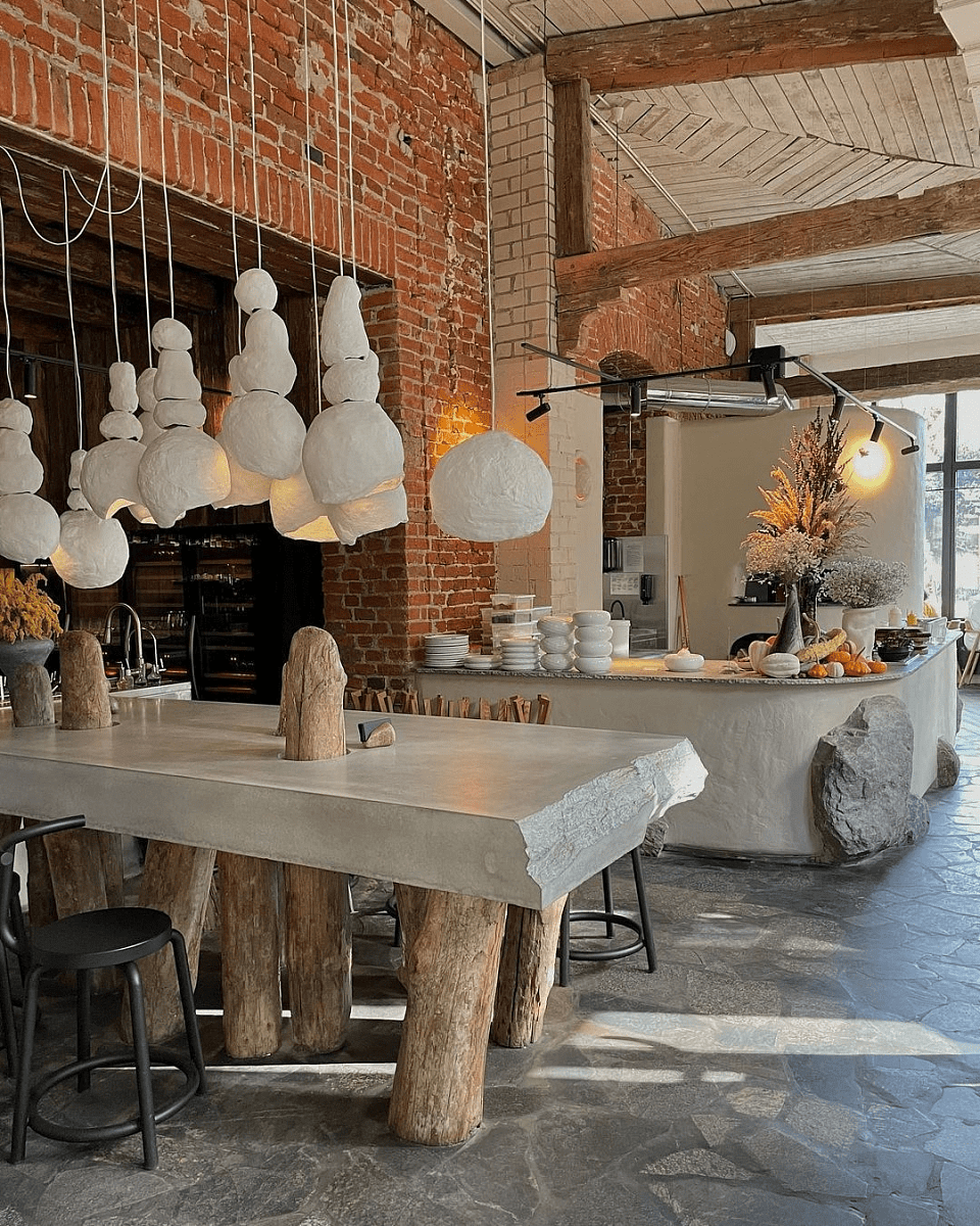 Auch das Interieur des Restaurants ist von der natürlichen Schönheit der Ostsee inspiriert. Minimalismus, Umweltfreundlichkeit und Funktionalität stehen im Mittelpunkt des Designs, wobei durchgehend natürliche Materialien und Texturen wie Stein, alte Holzstämme, Muscheln, Trockenblumen und handgefertigte Keramikvasen verwendet werden.