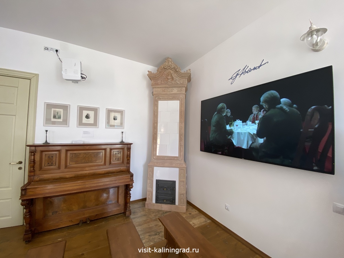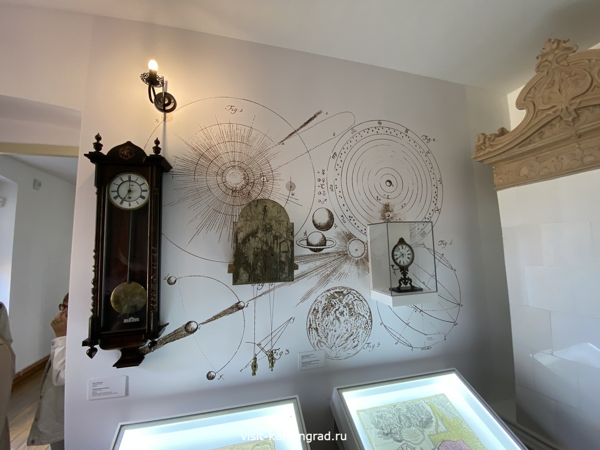 Среди экспонатов: оригинальные карты местности 17 и 18 веков оживают вместе с растениями и коллекцией минералов, которую со знанием дела собирал Алексей Соколов, директор Виштынецкого экомузея. Семьдесят фресок из архивов Мюнхенского института истории искусств* во всю стену сменяют друг друга, иллюстрируя историю станковой живописи Восточной Пруссии с 14 по 18 века с полным погружением и включением вас в ее контекст. Антикварные часы: напольные, настенные, ночные - со свечой - отбивают свой бой, следуя за пунктуальностью гения.