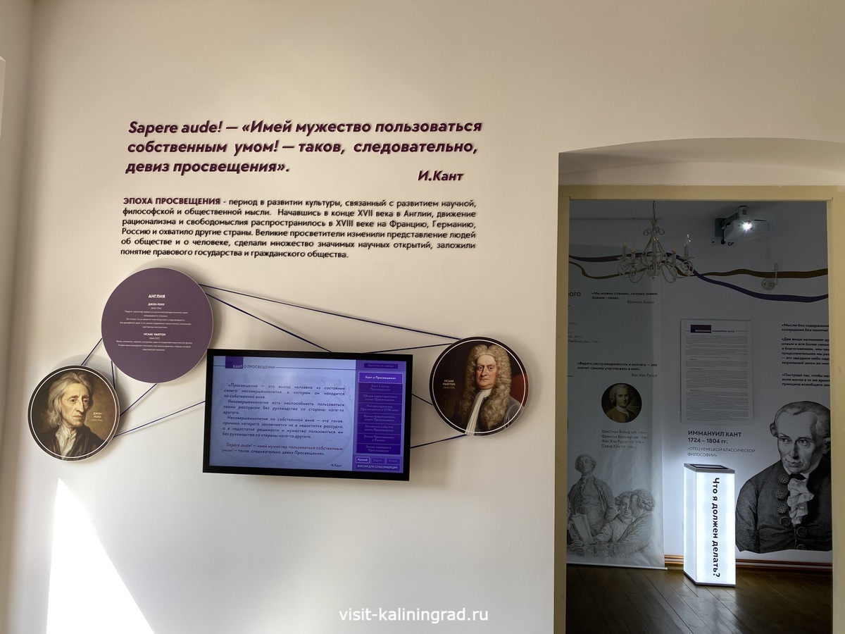 Экспозиция, посвящённая философии Канта, его жизненному пути и контексту времени, а также истории региона, религии и быта, представлена в метафорической форме с использованием интерактивных и мультимедийных элементов.