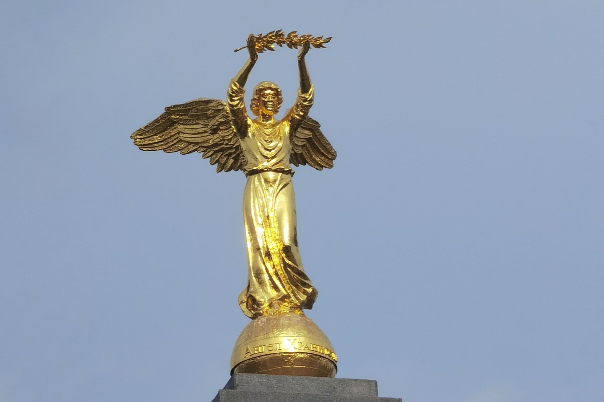 Центром скульптурной композиции является изготовленная из бронзы и покрытая сусальным золотом трехметровая фигура ангела с крыльями, который на поднятых над головой руках несет лавровую ветвь - символ мира.