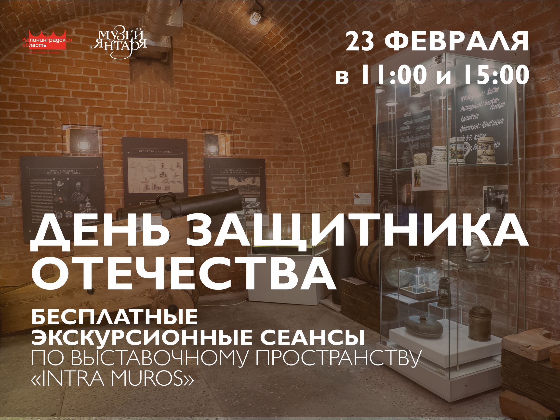 В понедельник, 23 февраля музей будет открыт для посетителей. В честь праздника в 11:00 и 15:00 пройдут бесплатные экскурсионные сеансы по выставочному пространству «INTRA MUROS». На экскурсии гид расскажет, как жили солдаты, как функционировала башня «Дона» в XIX и начале XX века, какую роль она сыграла в штурме 1945-го и как в ней был основан Музей янтаря в 1979 году.