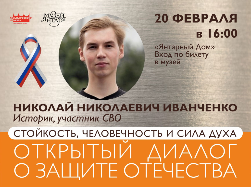 20 февраля в 16:00 Музей янтаря приглашает на встречу с историком и участником СВО Николаем Николаевичем Иванченко. Наша страна гордится мужеством защитников Отечества с начала своего существования и по сей день. Слава о подвиге русских воинов, не раз спасавших не только свою землю, но и человечество от войск Наполеона и Гитлера, живет до сих пор. Сегодня, как и века назад, наши воины защищают страну. Истории бойцов специальной военной операции учат нас тому, что любовь к Родине измеряется не словами, а поступками. Стойкость, человечность и сила духа - именно эти качества нужны, чтобы побеждать не только в бою. У слушателей будет возможность задать интересующие вопросы во время встречи. А дети участников специальной военной операции прочтут стихи в рамках творческого проекта «СВОи для СВОих».