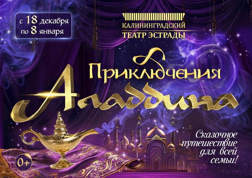 В новогодние праздники Калининградский театр эстрады приглашает юных зрителей и их родителей отправится в невероятное путешествие по мотивам волшебных арабских сказок. Зрителю открывается история о храбром юноше Аладдине, прекрасной принцессе Жасмин и их верных друзьях.