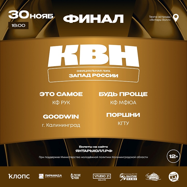 Лига Международного Союза КВН «Запад России» приглашает на финал 18-ого сезона! Не смотря на холод и балтийский ветер, в последнее осеннее воскресенье – 30 ноября, ждём вас в очень теплой и уютной атмосфере светлогорского театра эстрады «Янтарь-Холл» – именно тут мы узнаем, кто станет чемпионом! Перед приходом зимы будем вместе согреваться своими силами – зажигательным юмором от лучших команд сезона: