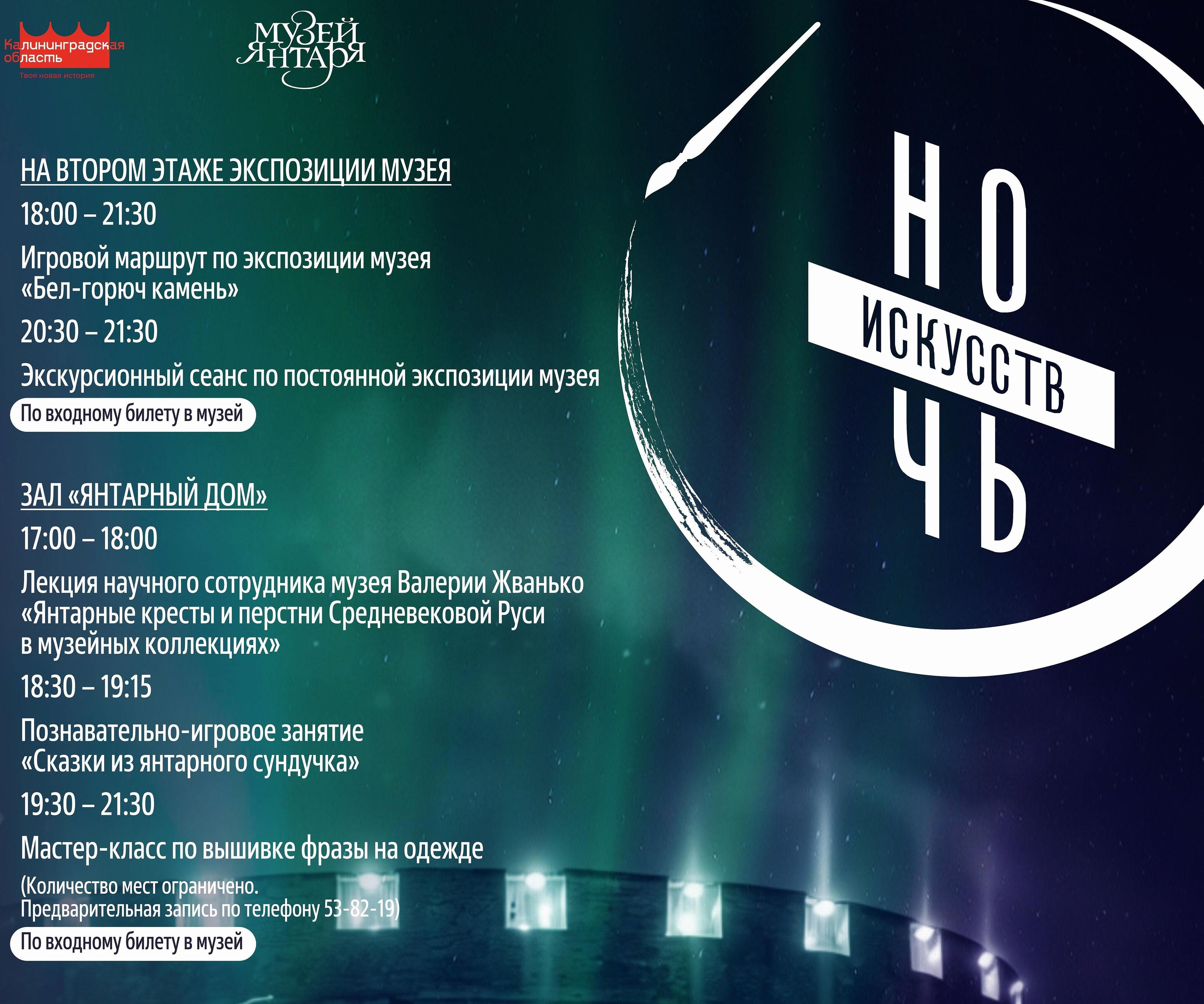 3 ноября приглашаем в Музей янтаря на праздничную программу «Ночь искусств». С 17:00 до 21:30 дети и взрослые смогут познакомиться с музейной экспозицией с помощью интерактивного путеводителя, принять участие в лекциях, экскурсиях и мастер-классах, а также получить в подарок сувениры от музея. КУПИТЬ БИЛЕТЫ.