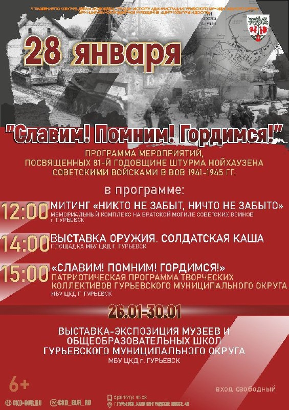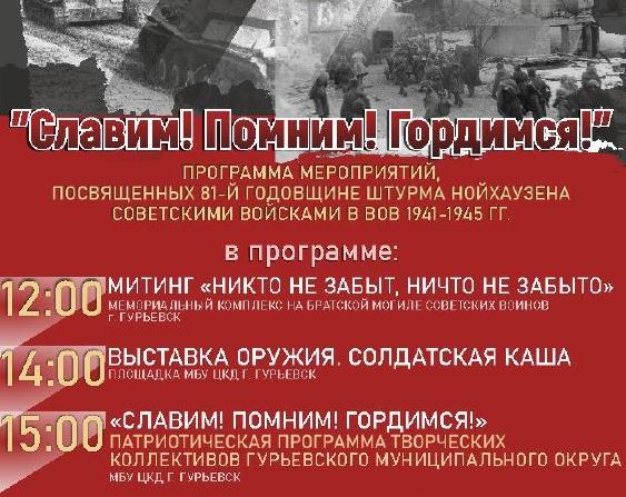 Жителей и гостей города Гурьевска приглашают стать участниками патриотической программы "Славим! Помним! Гордимся!", посвящённой 81-й годовщине взятия Нойхаузена советскими войсками в Великой Отечественной войне 1941-1945 гг.