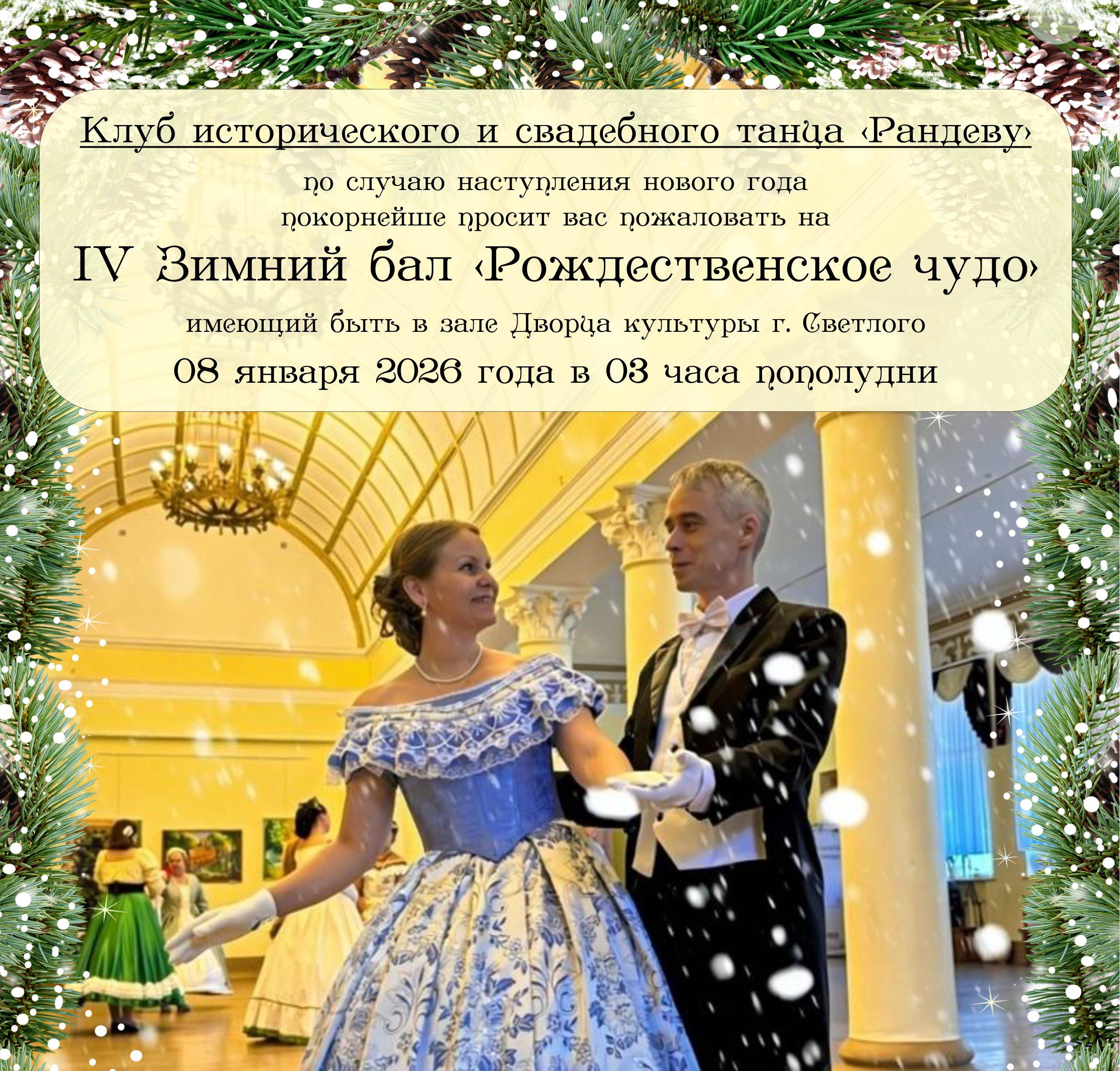 Клуб исторического и свадебного танца "Рандеву" по случаю наступления нового года и Рождества приглашает на IV Зимний бал "Рождественское чудо", который состояится в зале Дворца культуры г. Светлого
