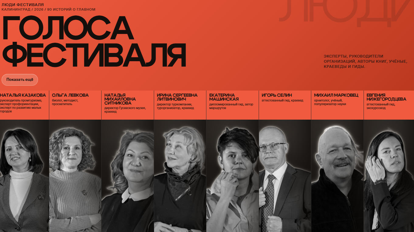 Фестиваль «80 историй о главном» — просветительский проект Российского общества «Знание», посвященный 80-летию Калининградской области. Фестиваль проходит в Калининграде с 28 марта по 19 июля 2026 года и объединяет 52 события: лекции, открытые диалоги, выставки, экскурсию и иммерсивный спектакль. Большинство мероприятий бесплатные и доступны по регистрации на официальном сайте фестиваля.