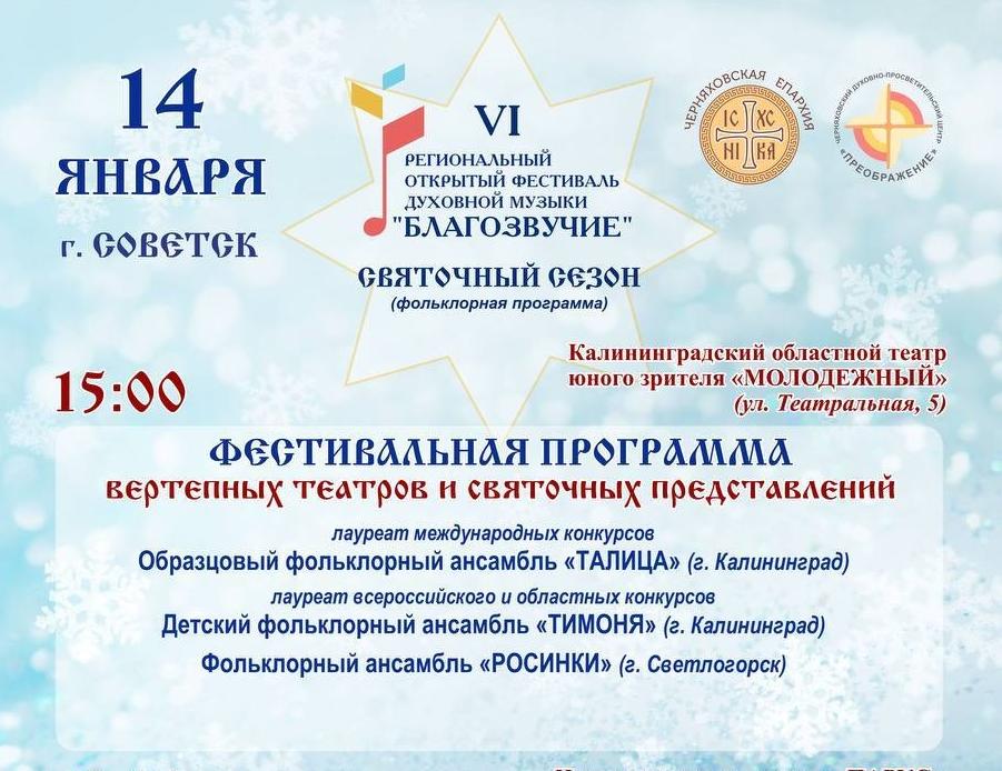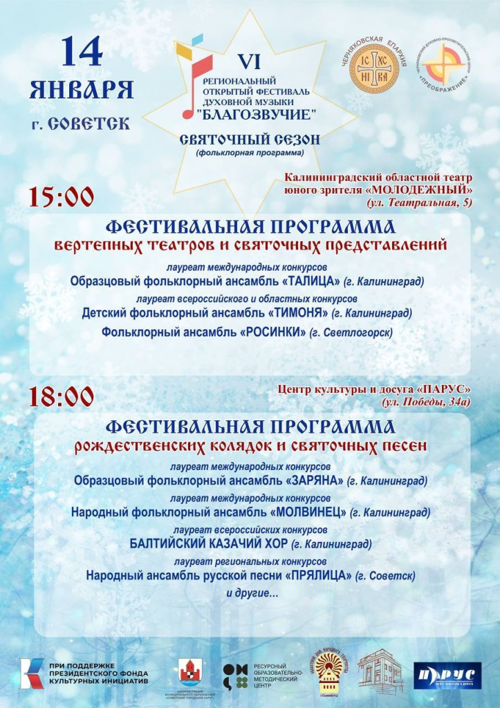 Фестиваль «Благозвучие» - развитие духовной музыки на Калининградской земле при поддержке Президентского Фонда культурных инициатив пройдут мероприятия фольклорной программы Святочного сезона VI Регионального открытого фестиваля духовной музыки «Благозвучие», организованного АНО Черняховский духовно-просветительский центр «Преображение» и Черняховской епархией Русской православной церкви в партнёрстве с Ресурсным образовательно-методическим центром и Областным Домом народного творчества.