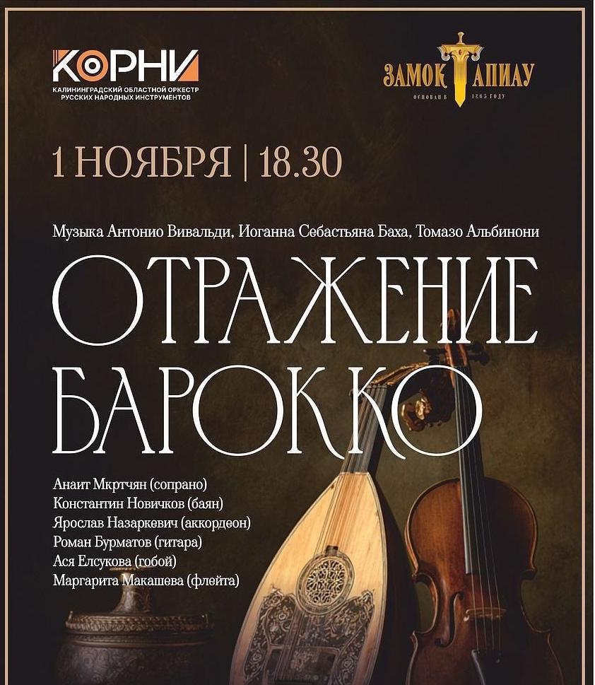 В исторических интерьерах замка Тапиау выступят артисты Калининградского областного оркестра русских народных инструментов Анаит Мкртчян (сопрано), Константин Новичков (баян), Ярослав Назаркевич (аккордеон), Роман Бурматов (гитара), Ася Елсукова (гобой) и Маргарита Макашева (флейта).