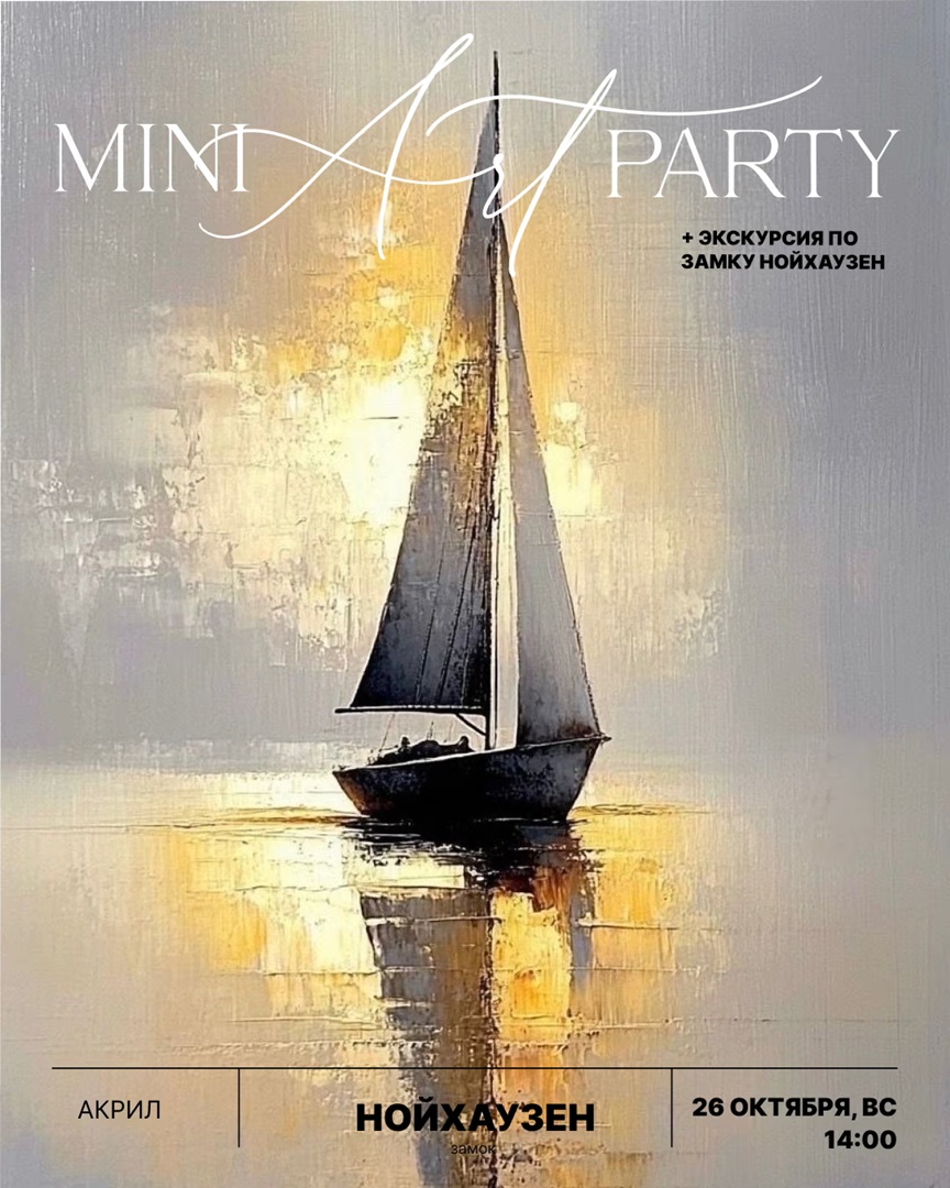 Сначала нас ждёт экскурсия по величественным залам и территории замка, где история оживает в каждом камне. А затем — живописный мастер-класс: будем писать завораживающий своей красотой корабль на мини-холстах 15×20 см.