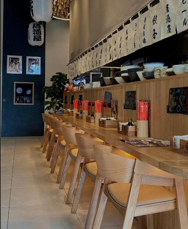 Интерьер суши-бара выполнен в японском стиле, с приглушенным светом и натуральными материалами.