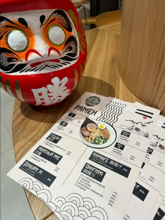 Здесь представлен широкий выбор блюд, таких как суши, роллы, рамен и онигири, а также десерты, такие как моти и чизкейки.