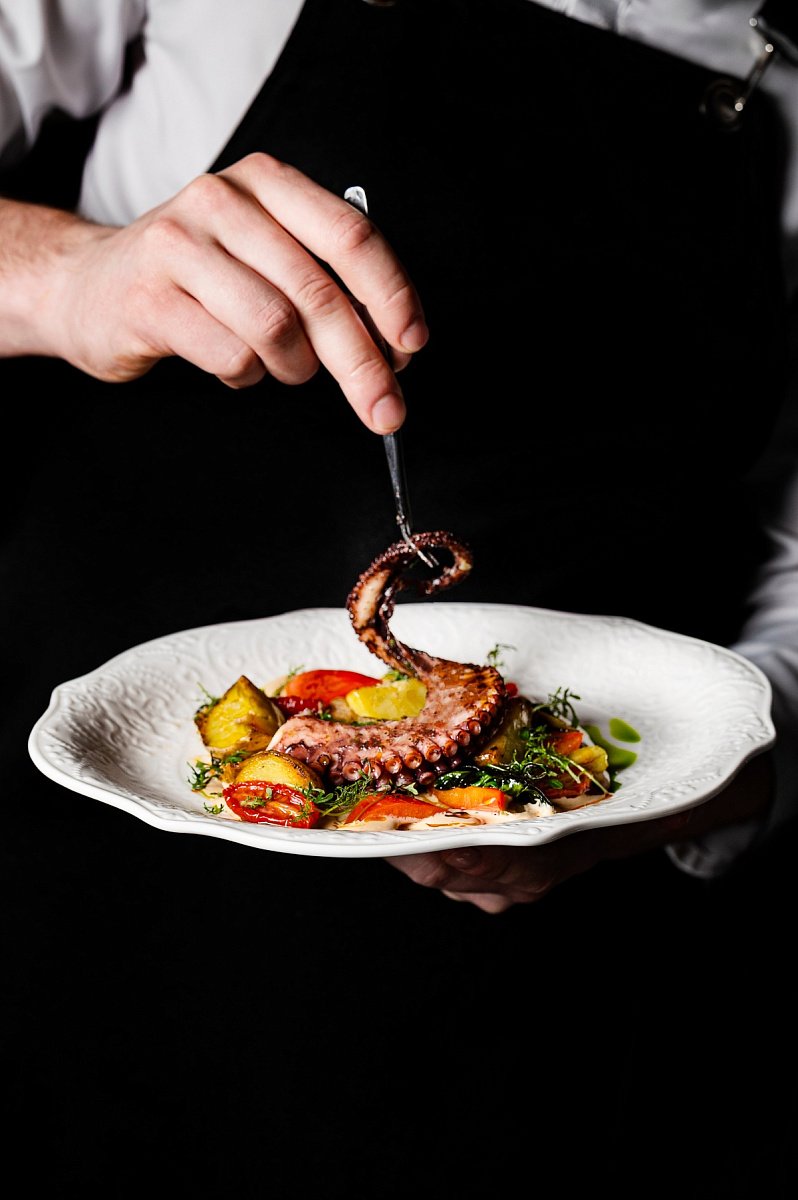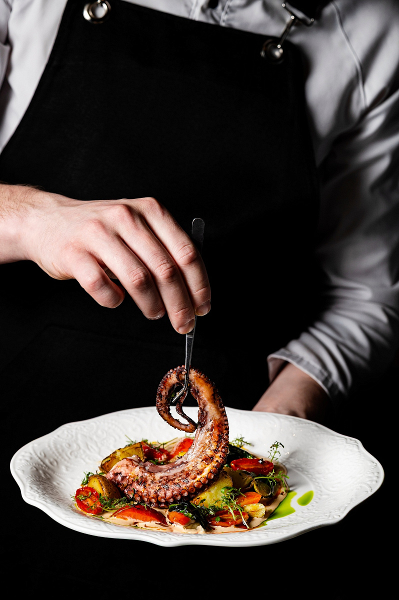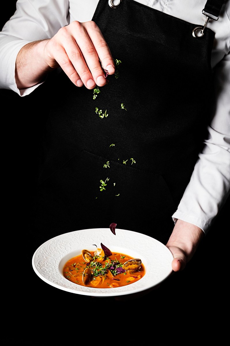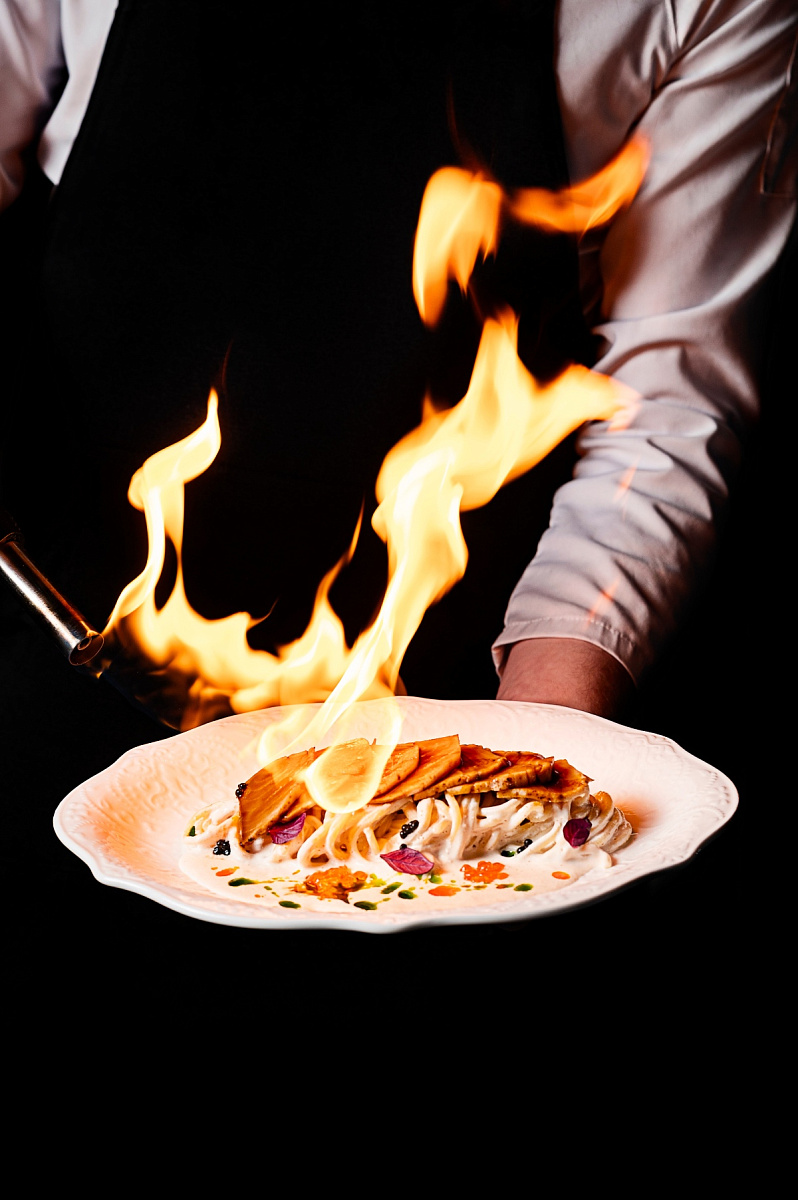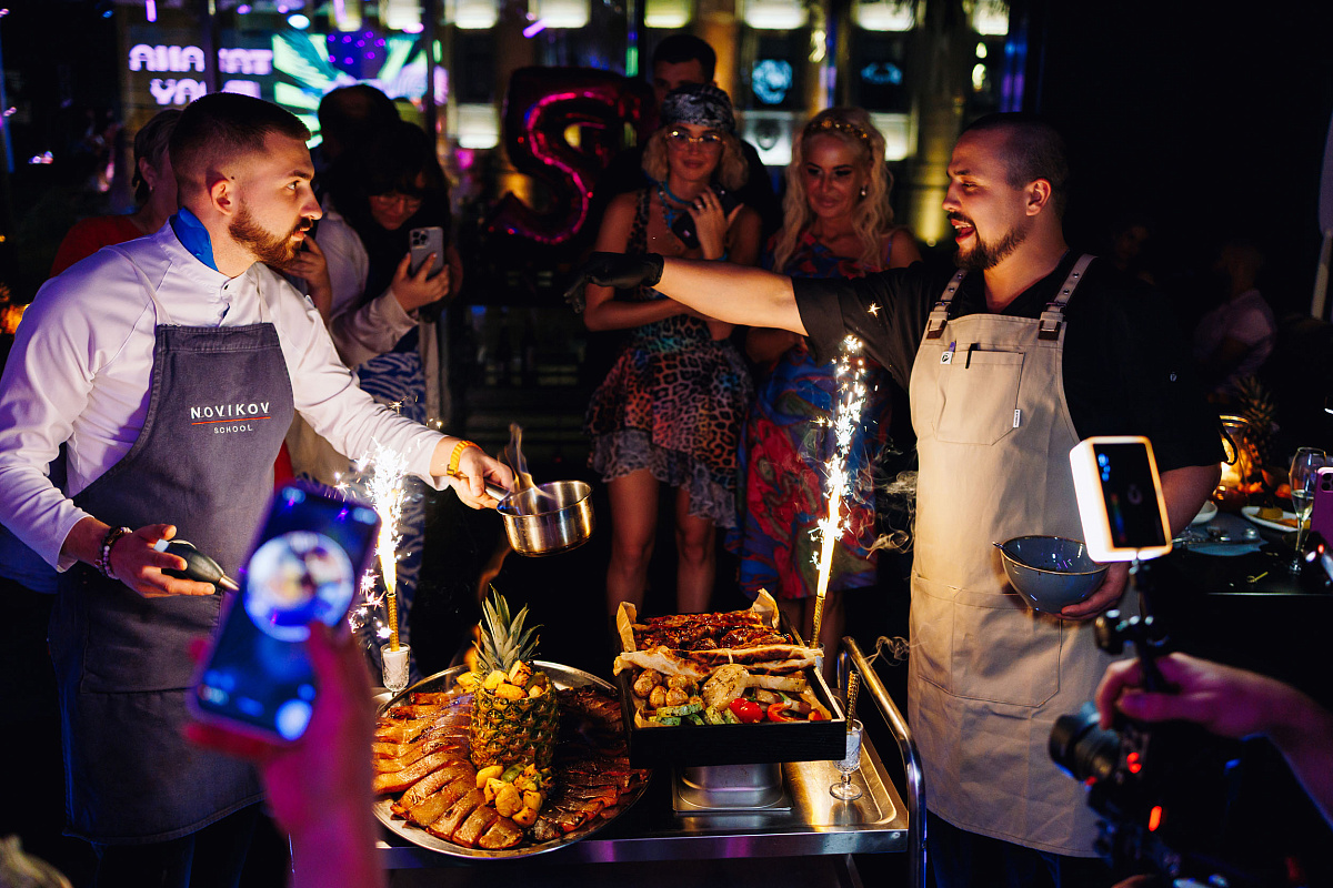 В меню представлены блюда русской кухни в современной адаптации: угольные пельмени из нельмы, сочные котлеты по-пожарски, пшенная каша, пропаренная до идеальной мягкости, которая сопровождается изысканными раковыми шейками, килька на бородинской земле и медовик.