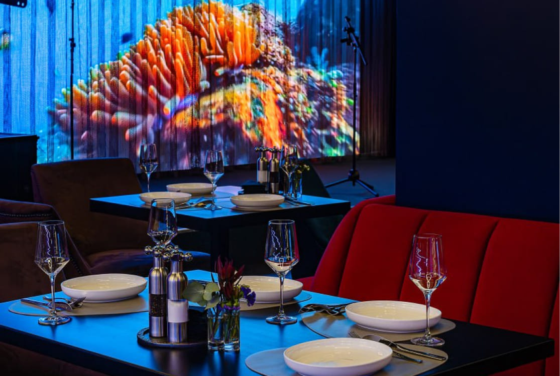Интерьер ресторана "Океан" выполнен в тематическом морском стиле. Необычный декор подводной растительности, градиентные тона стен, светильники в форме медуз и экзотических рыб придают помещению особый изысканный шарм. Атмосфера подводного мира, музыка и танцы!