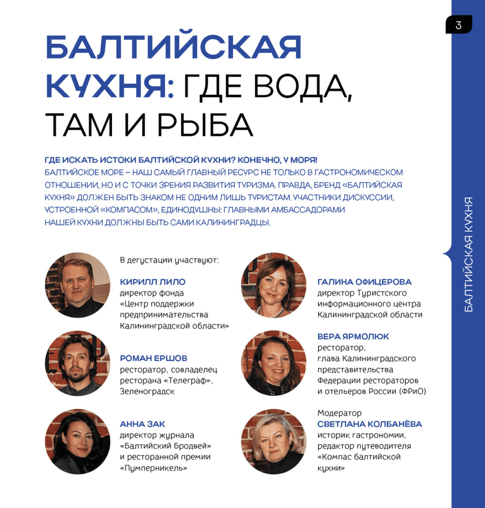 - «Где вода, там и рыба». Беседа при участии директора Фонда поддержки предпринимательства "Мой бизнес" Калининградской области Кирилла Лило, директора ТИЦ Галины Офицеровой, гастрономических экспертов, издателей «Компаса балтийской кухни»;