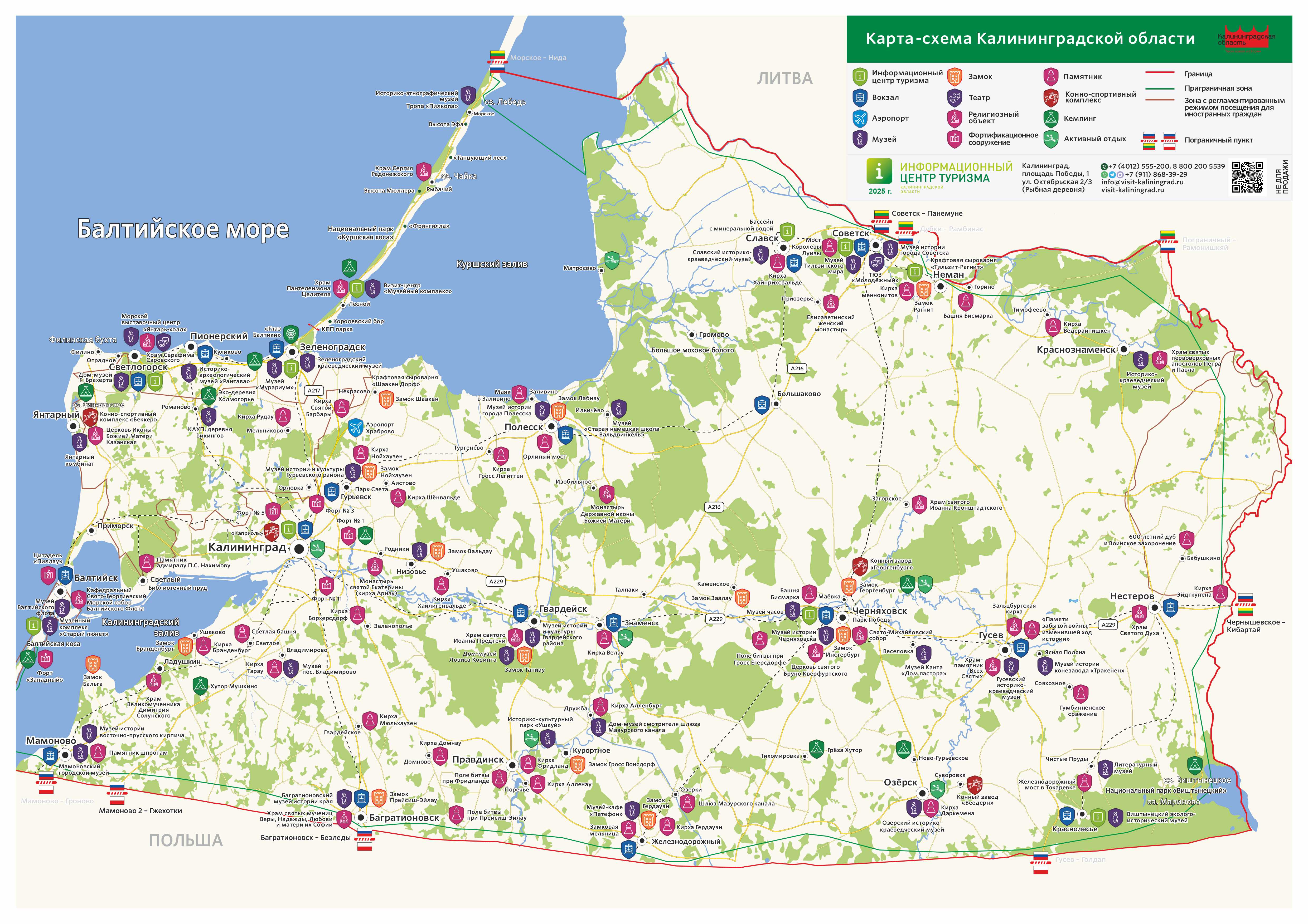 Бесплатную карту-схему Калининградской области с достопримечательностями можно получить в офисах Туристского информационного центра в Калининграде.